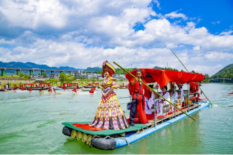2020年8月23日11點,“世界第一風雨廊橋”——“重慶黔江濯水風雨廊橋”下寬闊而清澈的阿蓬江面上,身穿民族服裝的“阿哥阿妹”俏生生地站在佩戴紅綢和大紅花的喜船上,在艄公的牽引下上演一場別開生面的鵲橋相會,吸引了來自全國各地的游客駐足打卡拍照。