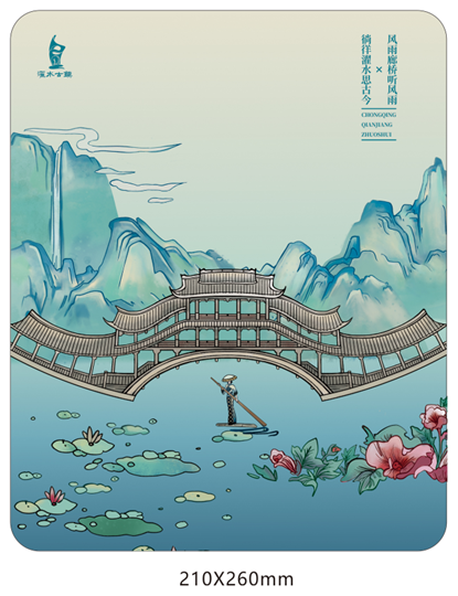 手繪岱山秀水間,檐角飛來鳳翅的風雨廊橋唐鐘長韻段為鼠標墊主視覺畫面,呈現秀美山水輝映錦繡人文的古韻意境之美。集實用性與地域特色性的旅游文創。