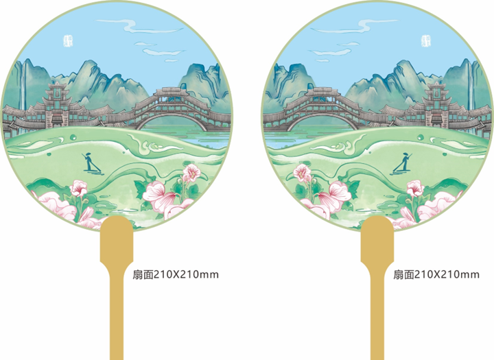 以岱山秀水間,形如波浪起伏,狀若龍行鳳舞的風雨廊橋為核心手繪創作為扇面,呈現秀美山水輝映錦繡人文的古韻意境之美。